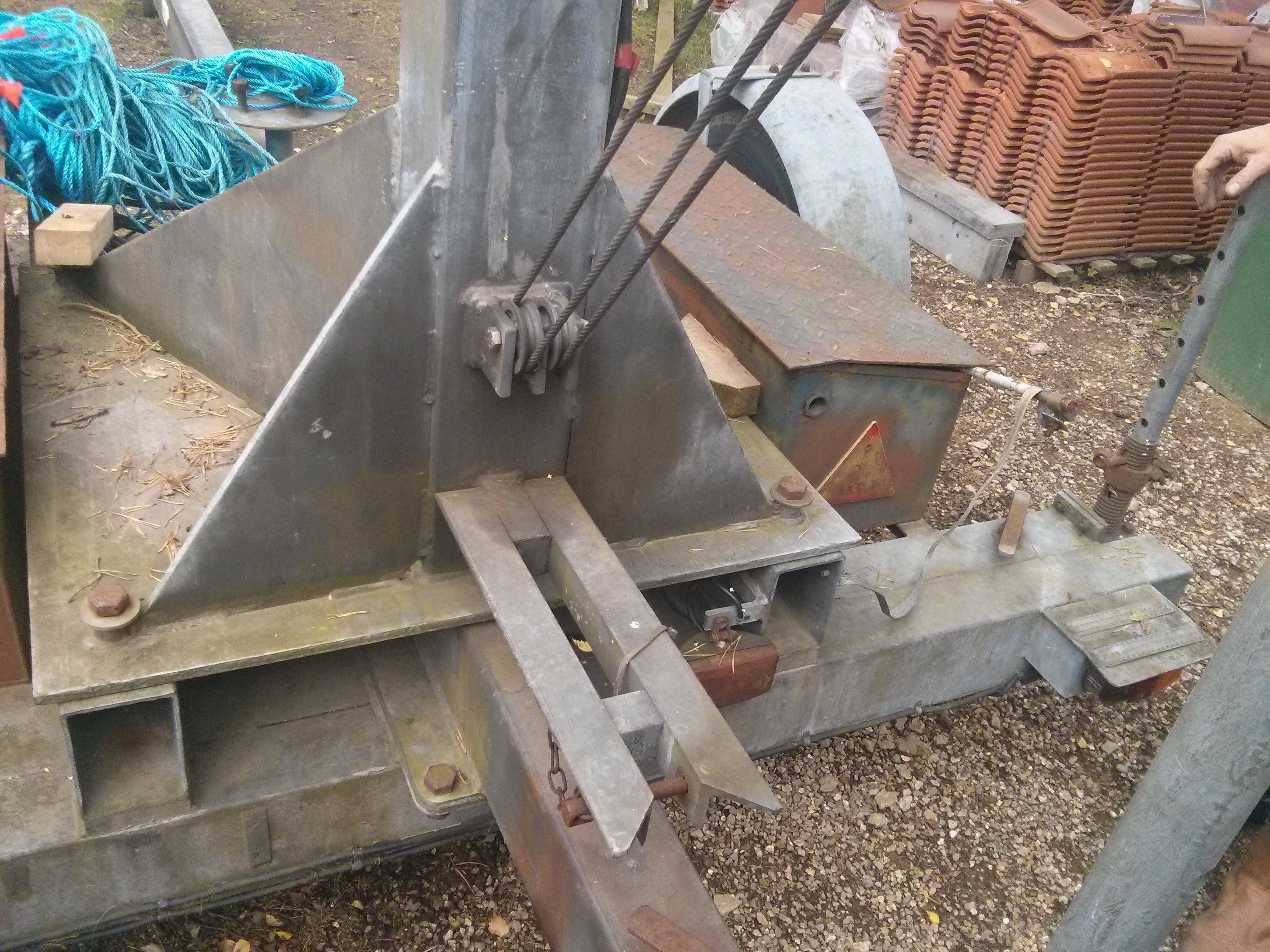 Having now had time to inspect what I've bought, here's a photo of the post that was cut, presumably with an angle grinder. At the bottom, you can see that it was cut around the block that accepts the tilt-over rode, as shown in the example photo of an 85ft trailer mounted tower. I did have thoughts about sticking an I-beam up the post, but this can't be done due to the tube that passes through the post behind the luffing rope pulleys. Conversion to a baseplate mount seems favourite.