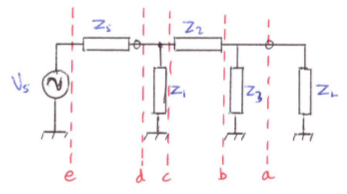 We first draw lines separating the individual components, or 'planes'. We work backwards from the load, calculating either the admittance or the impedance, dependent on whether the next component is in shunt or series. When we have finally got to the source, we have a number of admittance and impedance expressions that only need to be multiplied together to obtain the transfer function. This may be proved by nodal analysis working in the other direction, from front to back: